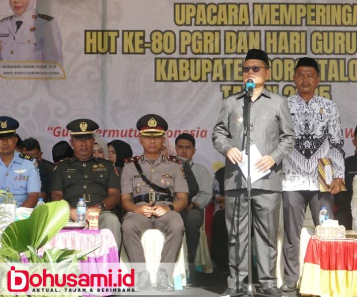 BOHUSAMI ID, GORUT – Bupati Gorontalo Utara, Thariq Modanggu, menjadi inspektur upacara peringatan hari ulang tahun (HUT) Persatuan Guru Republik Indonesia (PGRI) ke – 80 tingkat Kabupaten Gorontalo Utara bertempat di halaman kantor Bupati Gorontalo Utara. Kegiatan yang berlangsung dihalaman kantor Bupati ini, Bupati mengajak seluruh guru untuk terus meningkatkan kualitas pendidikan di Kabupaten Gorontalo Utara. Selasa (25-11-2025).