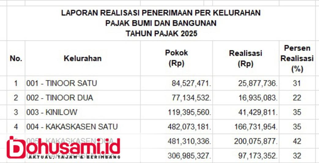 Berdasarkan laporan realisasi per kelurahan, beberapa wilayah mencatat capaian di atas 60 persen, antara lain Kelurahan Kolongan (64%), Kolongan Satu (68%), Uluindano (72%), Walian Dua (76%), Pinaras (61%), dan Pangolombian (52%).
