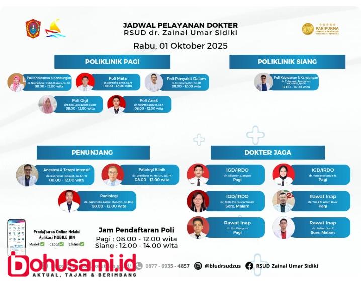 BOHUSAMI.ID, GORUT – Rumah Sakit Umum Daerah (RSUD) dr. Zainal Umar Sidiki kembali merilis jadwal pelayanan dokter untuk Rabu, 1 Oktober 2025. Informasi ini disampaikan pihak rumah sakit sebagai bentuk transparansi dan kemudahan akses bagi masyarakat yang ingin mendapatkan layanan kesehatan.