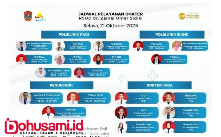 BOHUSAMI.ID, GORUT – RSUD dr. Zainal Umar Sidiki Kabupaten Gorontalo Utara (Gorut) kembali merilis jadwal pelayanan dokter untuk Selasa, 21 Oktober 2025, yang mencakup layanan poliklinik pagi dan siang, penunjang medis, serta dokter jaga di berbagai unit pelayanan rumah sakit.