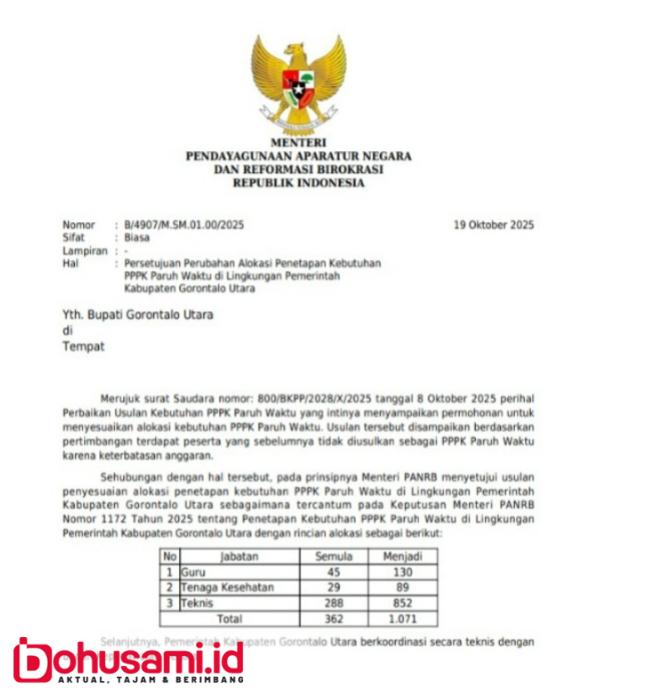 Seharusnya kita patut bersyukur, karena surat  Bupati Gorontalo Utara nomor: 800/BKPP/2028/X/2025 tanggal 8 Oktober 2025 perihal Perbaikan Usulan Kebutuhan PPPK Paruh Waktu yang di bawa langsung oleh Bapak  Bupati Gorontalo Utara, Thariq Modanggu  sudah di setujui Kementrian Pendayaguanaan Aparaur Negara dan Reformasi Birokrasi sudah disetujui dengan surat Nomor : B/4907/M.SM.01.00/2025  tanggal 19 Oktober 2025 hal  Persetujuan Perubahan Alokasi Penetapan Kebutuhan PPPK Paruh Waktu di Lingkungan Pemerintah Kabupaten Gorontalo Utara yang tadinya 362 menjadi 1071, ungkap Sekda Suleman Lakoro.
