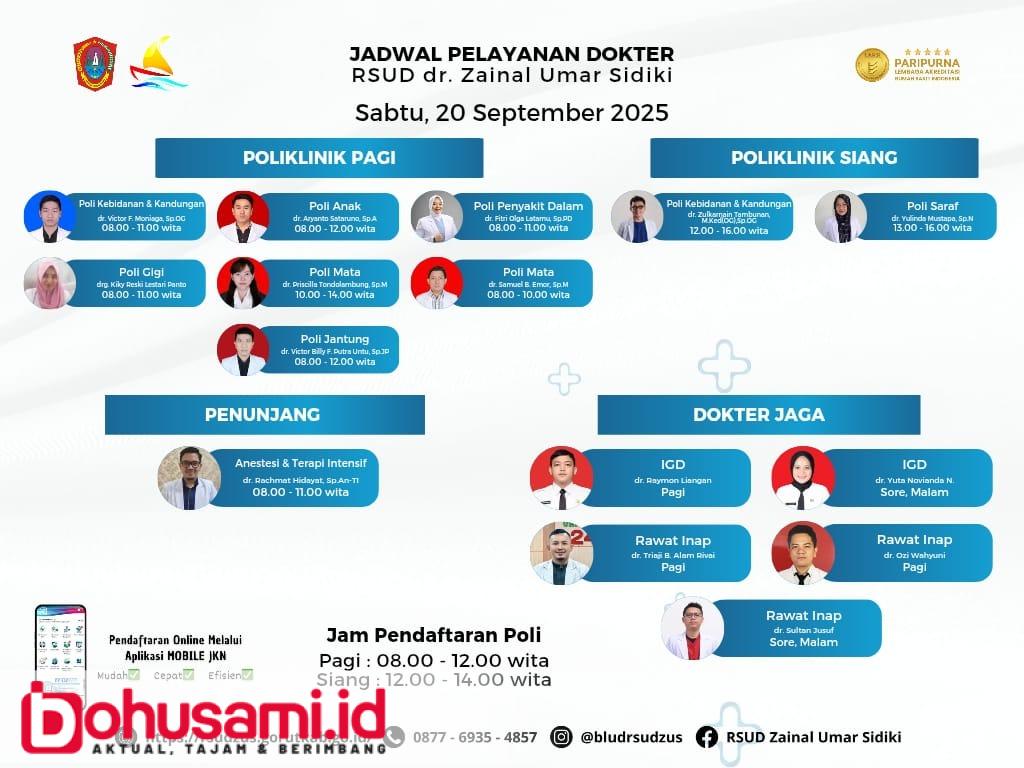 BOHUSAMI.ID, GORUT – RSUD dr. Zainal Umar Sidiki (ZUS) Gorontalo Utara rilis jadwal praktek dokter spesialis untuk akhir pekan. Bagi banyak keluarga, akhir pekan sering kali identik dengan waktu istirahat atau berkumpul bersama. Namun, sebagian masyarakat justru memilih memanfaatkannya untuk memeriksakan kesehatan. Menjawab kebutuhan tersebut, RSUD dr. Zainal Umar Sidiki (ZUS) memastikan pelayanan dokter spesialis tetap buka pada Sabtu, 20 September 2025.