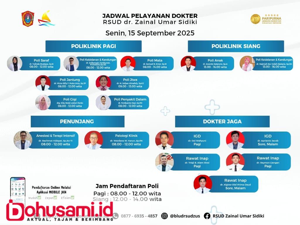 BOHUSAMI.ID, GORUT – Sebagai wujud transparansi layanan, RSUD dr. Zainal Umar Sidiki (ZUS) kembali merilis jadwal praktik dokter spesialis. RSUD ZUS Terus berkomitmen memberikan pelayanan kesehatan yang terjangkau dan berkualitas bagi masyarakat Gorontalo Utara. Sebagai wujud transparansi layanan, RSUD ZUS kembali merilis jadwal praktik dokter spesialis untuk Senin, 15 September 2025.