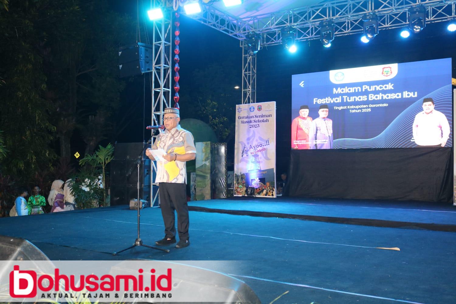 BOHUSAMI.ID, KABGOR – Upaya pelestarian budaya lokal terus menjadi perhatian Pemerintah Kabupaten (Pemkab) Gorontalo. Hal itu disampaikan Bupati Gorontalo Sofyan Puhi menutup Festival Tunas Bahasa Ibu di Taman Budaya Limboto, Sabtu malam (18/10).