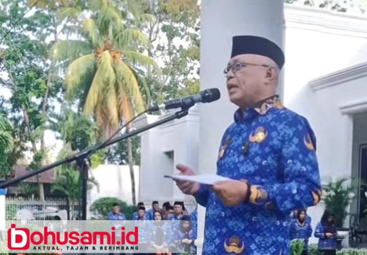 BOHUSAMI.ID, LIMBOTO — Bupati Gorontalo H. Sofyan Puhi memimpin apel korpri sekaligus dirangkaikan dengan memperingati Hari Kebangkitan Nasional (Harkitnas) ke-177 dan penyerahan penghargaan kepada 24 ASN yang purna tugas.