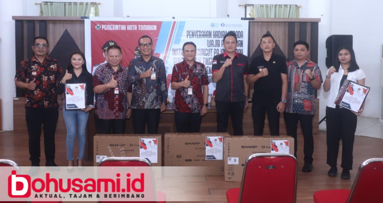 BOHUSAMI.ID, TOMOHON – Pemerintah Kota (Pemkot) Tomohon menyerahkan hadiah kepada wajib pajak (WP)dan instansi pemungut pajak daerah terbaik, berdasarkan tingkat kepatuhan dan penggunaan kanal pembayaran digital tahun 2025.