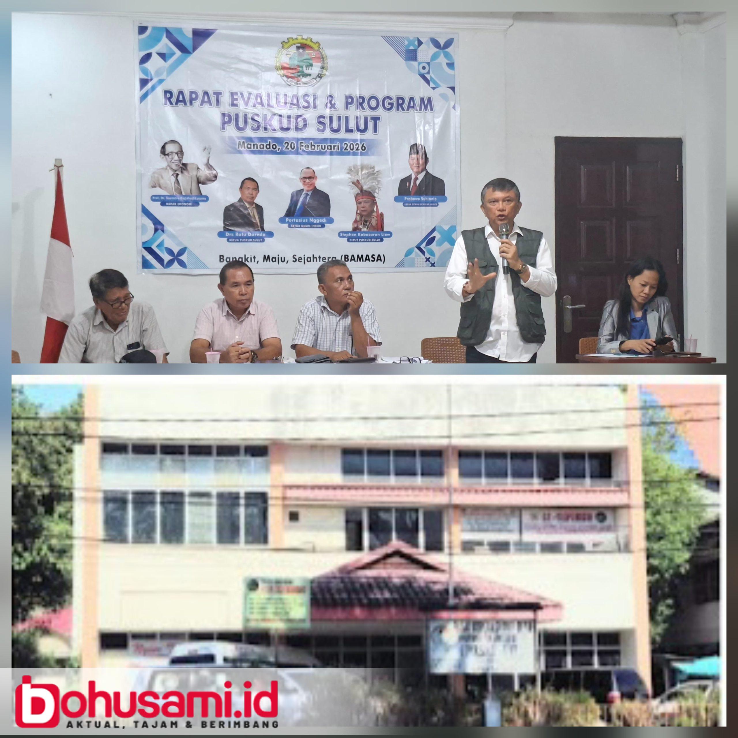 Dirut Puskud Sulut, Stephen Kabasaran Liow (berdiri) pada Rapat Evaluasi dan Program bersama jajaran Pengurus Puskud (atas). Gambar bawah eks kantor Puskud Sulut di kawasan Wanea, Kota Manado.